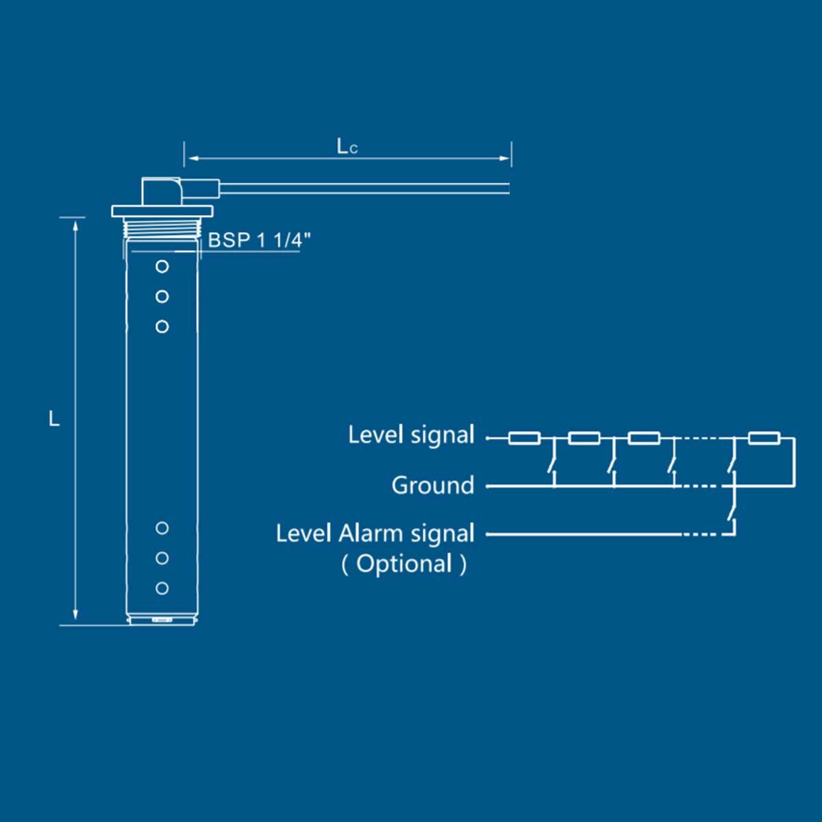 Il sensore è dotato di una filettatura BSP da 1 1/4" che consente di avvitarlo direttamente nel serbatoio. Il sensore è realizzato in acciaio inossidabile AISI 316 ed è impermeabile secondo lo standard IP67.